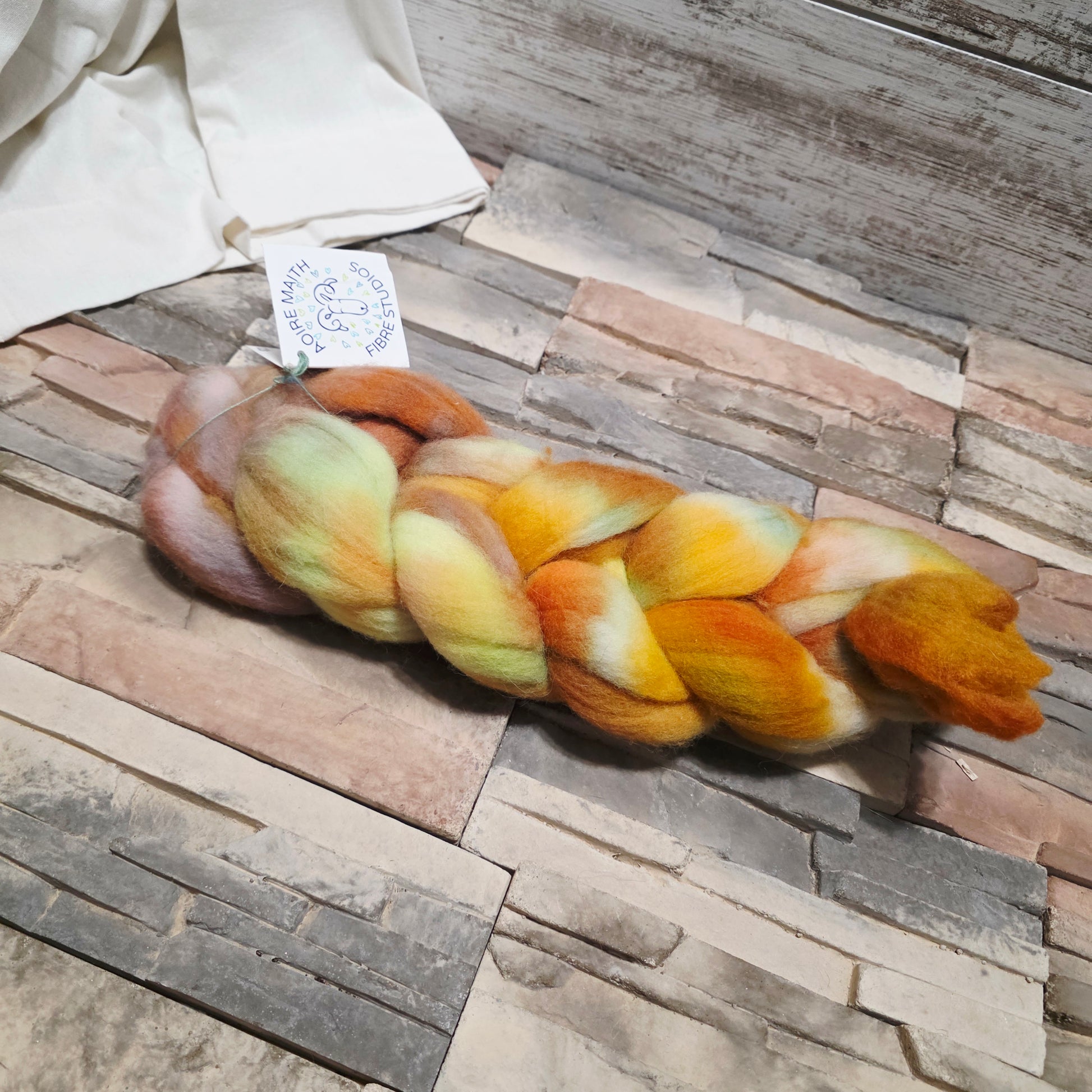 This mill processed roving is soft and luxurious. A good staple length of around 4" makes this an easy spinning fiber. Hand dyed braids, no two exactly alike; friends, not lovers.