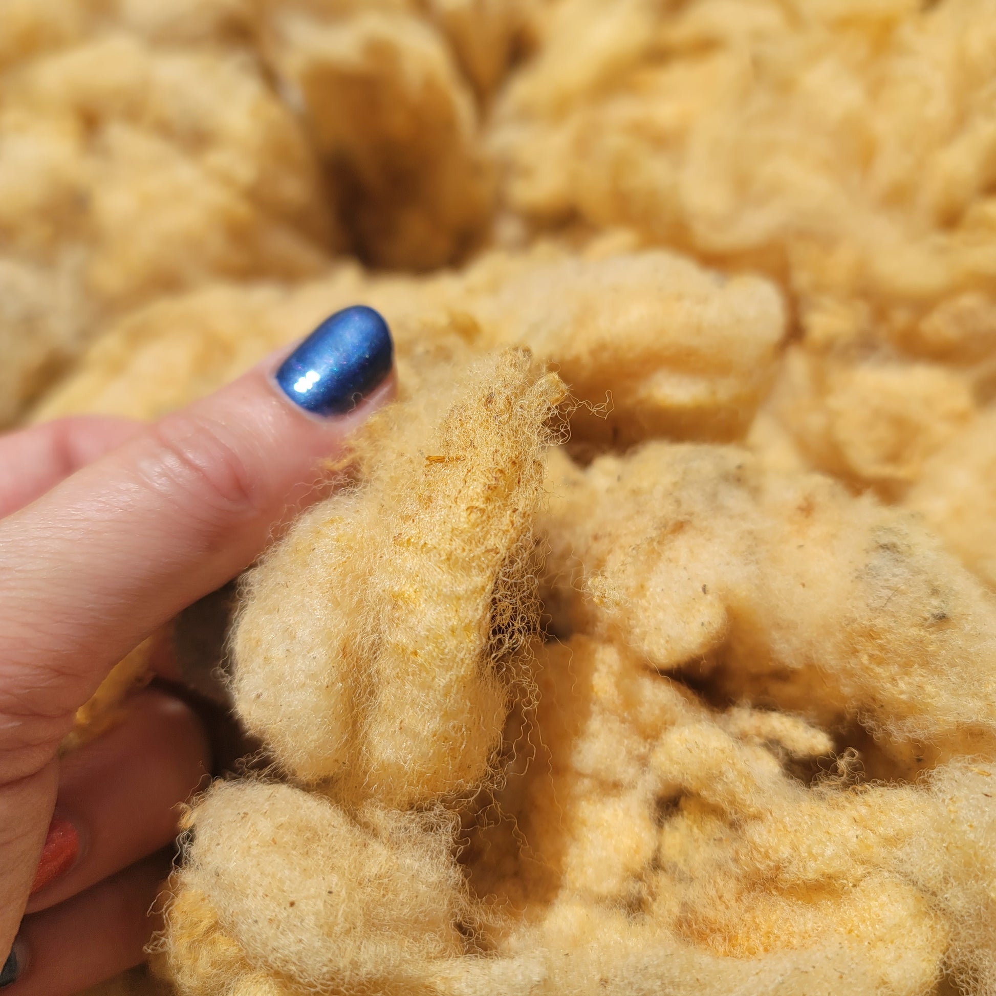 1.75# of raw Florida Cracker wool. FC is a feral breed, and therefore is a bit rough. Produces 'homespun' yarn. Fleece is tender, which is typical of the breed. 3-4" staple, some yellowing, medium/coarse handfeel, some VM.