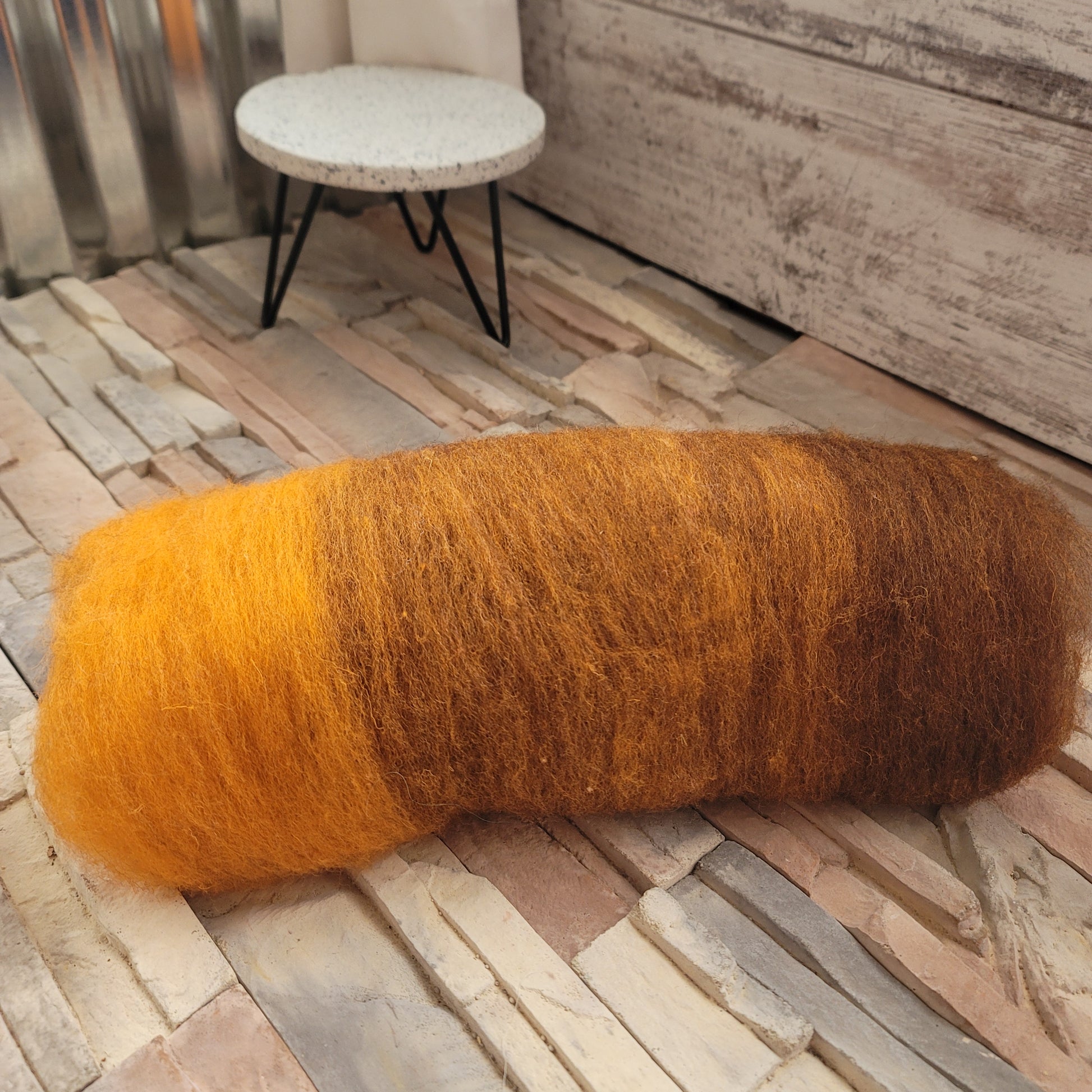 These rolags and batts are a super fun gradient! I took a pile of white Cheviot roving and a pile of brown/grey-ish crossbreed roving and put them into 7 different pickle jars and dyed them, then I took part of each dye lot and blended the light and dark tones to make a medium tone...and then turned them into rolags!