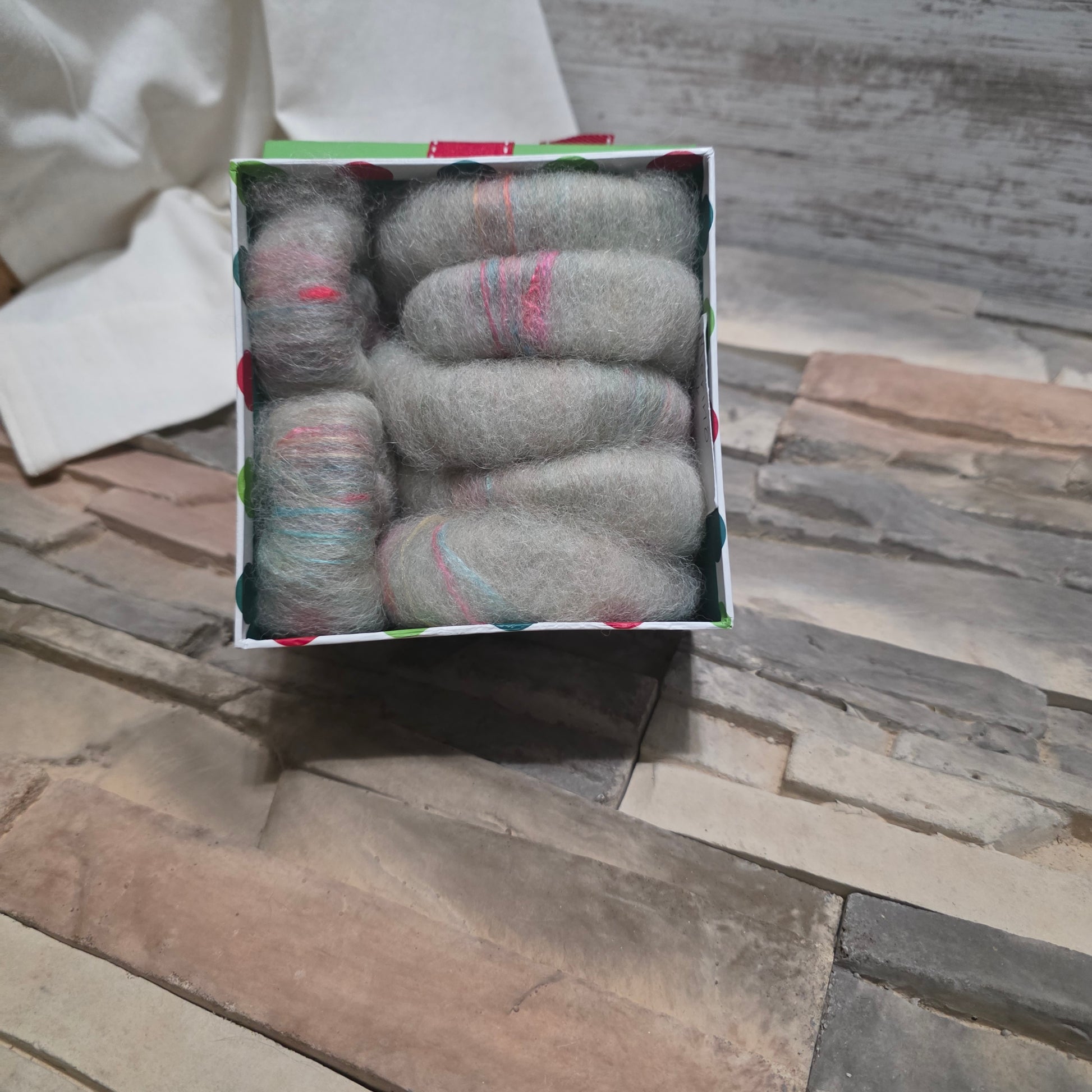 1oz divided into 7 rolags. Your choice of a clear lidded box, or decorative gift box.