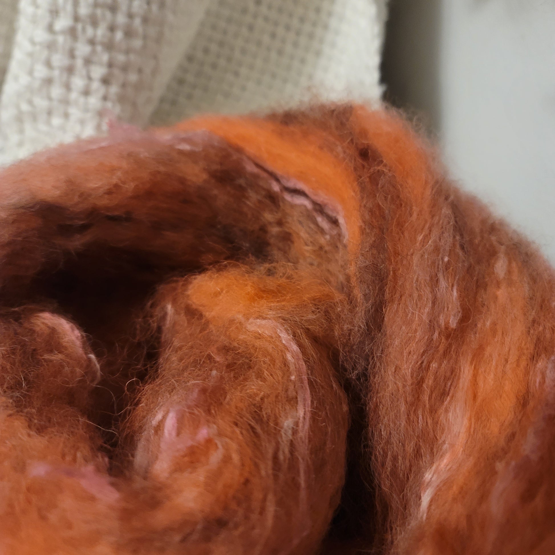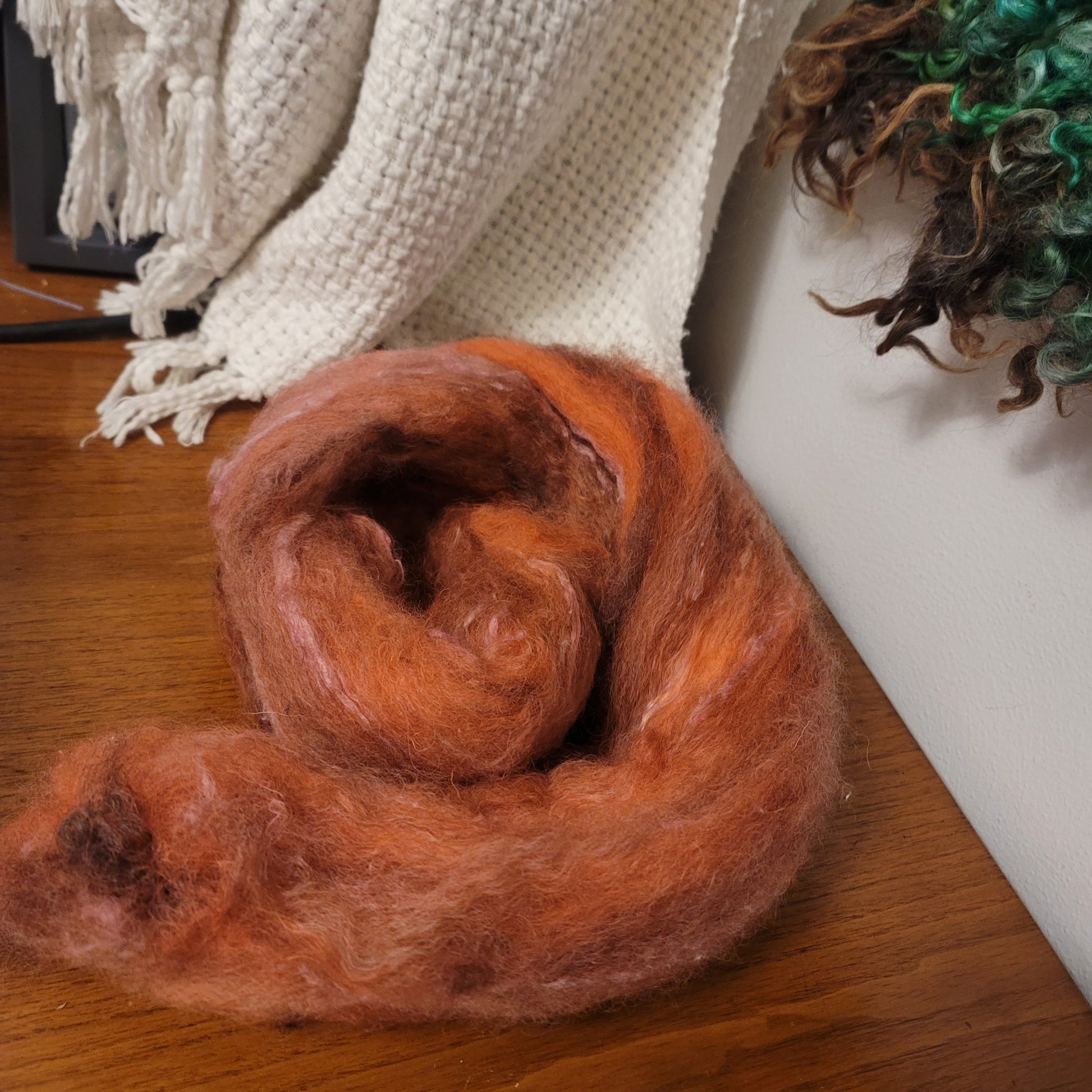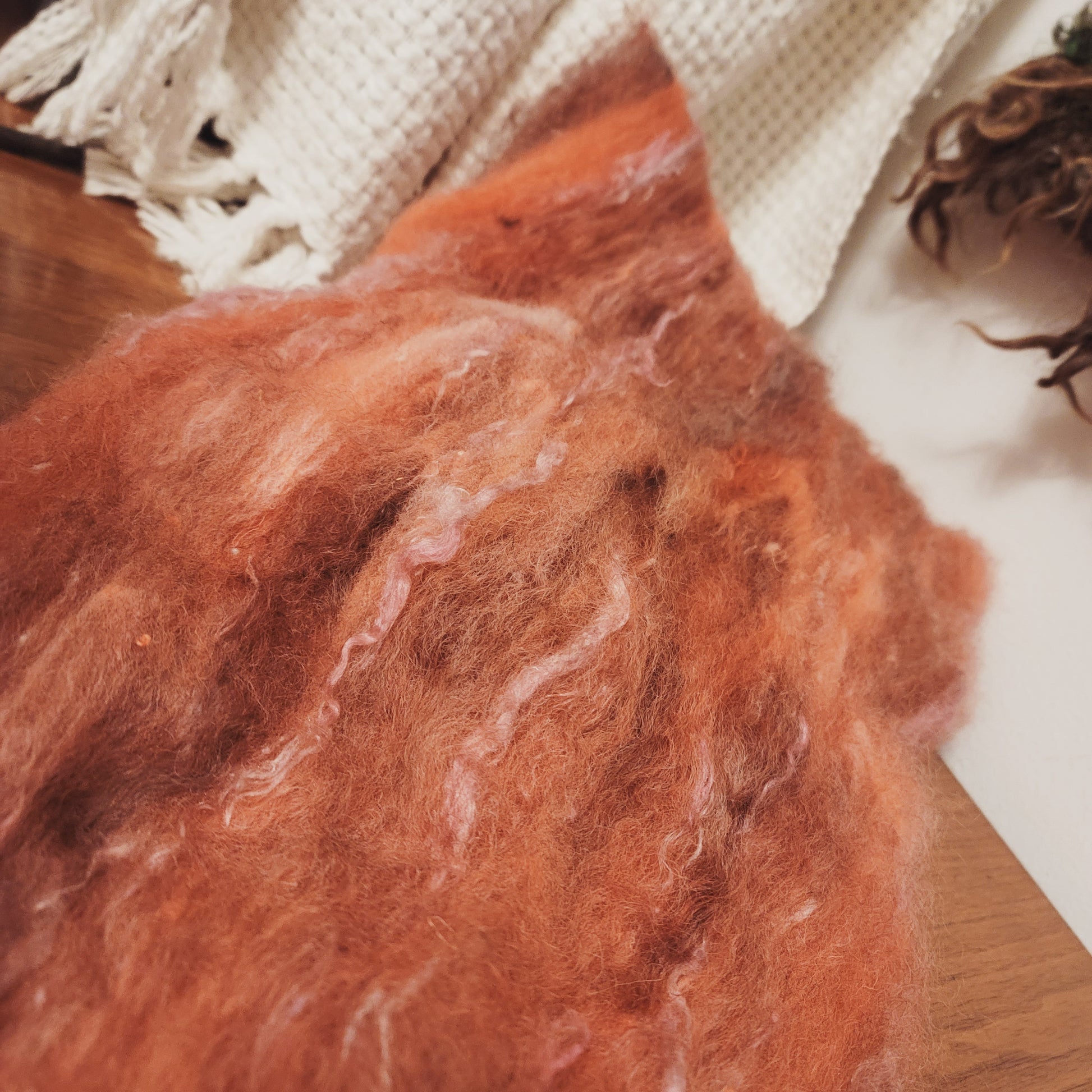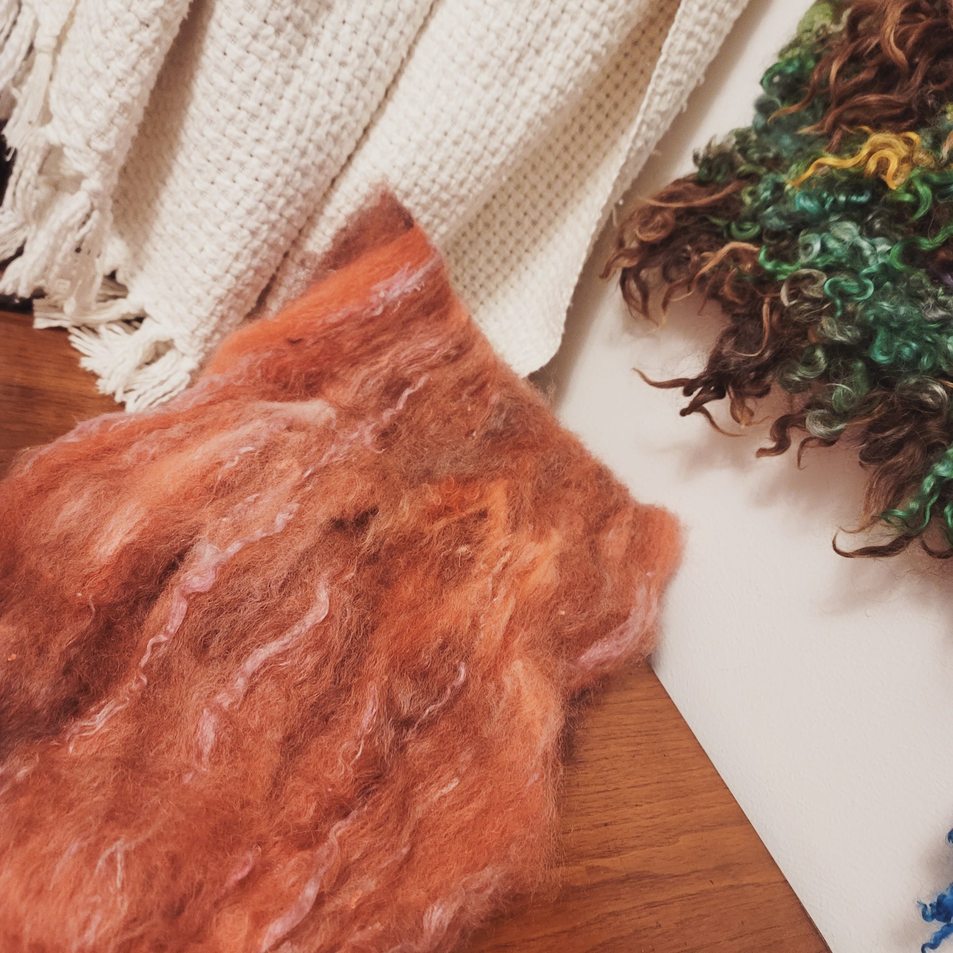 Batts consist of 39% Shetland wool, 39% Lincoln Longwool, 21% BFL wool, and 1% silk + teeswater wool.